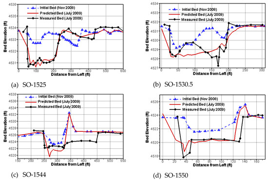 The erosion and deposition of the study reach in the period of 1 November 2008 to 31 July 2009 are simulated with the new model. The predicted channel bed elevation changes are compared with the cross-section data measured in July 2009. Comparisons at four cross sections are displayed in Figure 14. Overall, the reach is mostly erosional during the simulation period, which is expected as the plug formed in May 20018 was being eroded after the pilot channel was dug in October 2008. The agreement between the predicted and measured erosion is relatively good except for a small section between SO-1539 and SO-1544. At SO-1544, e.g., incising is predicted, not widening. This is due to that the new model does not simulate bank erosion so channel widening is not predicted.