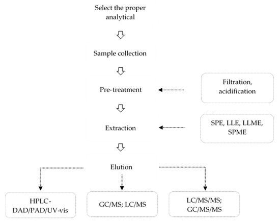 Figure 1 shows the analytical method that is essential to investigate the occurrence of PPCPs in the environment, whichs consists of several main steps. This includes selecting appropriate analytical instruments (Table 3), which depend on the characteristics of PPCPs; extracting and purifying the samples by using techniques such as solid-phase extraction (SPE), liquid-liquid extraction (LLE), liquid-liquid micro-extraction (LLME), and solid-phase micro-extraction (SPME) that was introduced in various studies [43,44]; and optimizing of measurement parameters.