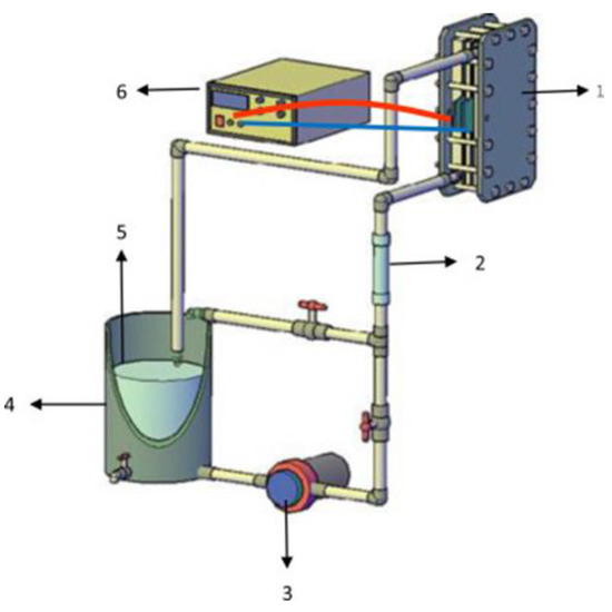 Experimental setup of 4 L undivided filter flow press reactor used for the treatment of paracetamol and diclofenac. 1. flow electrolytic cell, 2. flow meter, 3. peristaltic pump, 4. reservoir, 5. sampling, and 6. power supply. Reprinted from García-Montoya et al. [50], copyright © (2015), with permission from Elsevier.