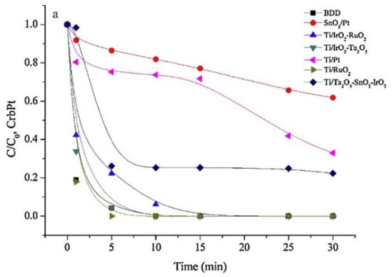 Barışçı et al. [59] showed the performance of electrodes was significantly different for the anti-cancer drug carboplatin degradation with various mixed metal oxide (MMO) electrodes and BDD electrode (Figure 4). CV voltammograms unveiled that BDD, Ti/IrO2-RuO2, Ti/RuO2, and Ti/IrO2-Ta2O5 anodes had the highest levels of oxygen evolution and the poorest anodes were SnO2/Pt, Ti/Pt and Ti/Ta2O5-SnO2-IrO2. Besides, higher oxygen evolution overpotential explained the formation of OH* on the surface of anode instead of molecular oxygen, which improved the efficiency.