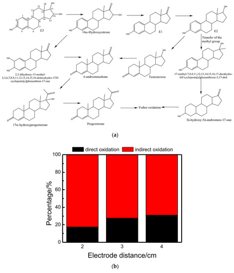 Proposed simplified pathways for estriol (E3) degradation in batch 3D electrolysis (a) and (b) the contribution of direct and indirect oxidation at various distances under operating conditions: C0 = approximately 1000 μg/L, j = 2.2 mAcm−2, constant current, Q = 150 mL/min. Reprinted from Shen et al. [69], copyright © (2017), with permission from Elsevier.