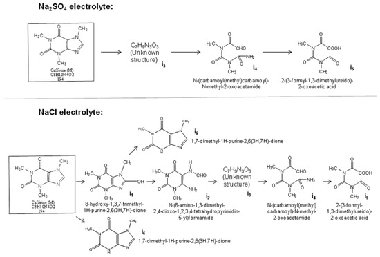 In the presence of NaCl as the supporting electrolyte, the degradation rate of PPCPs was favored. Experiments on RuO2/Ti, IrO2/Ti, RuIrO2/Ti, and Pt Ti electrodes showed a constant reaction rate in NaCl solution three to five times higher than in Na2SO4 and the oxidation rate of berberines increased due to active chlorine formation [90]. Ambuludi et al. [98] indicated that the pseudo-first-order rate constant increased when NaCl replaced Na2SO4 as the electrolyte support and it was almost unaffected by the concentration of ibuprofen. Otherwise, the poor mineralization of ketoprofen was due to the formation of chlorinated organic compounds, which are refractory, at both BDD and Pt anodes in the presence of NaCl as supporting electrolyte while total mineralization using Na2SO4 as an electrolyte was achieved [82]. Indermuhle et al. [97] found using NaCl, compared to Na2SO4, caffeine could reach a faster degradation but more reaction intermediates are formed and the mechanism is consistent with other proposed (Figure 6).