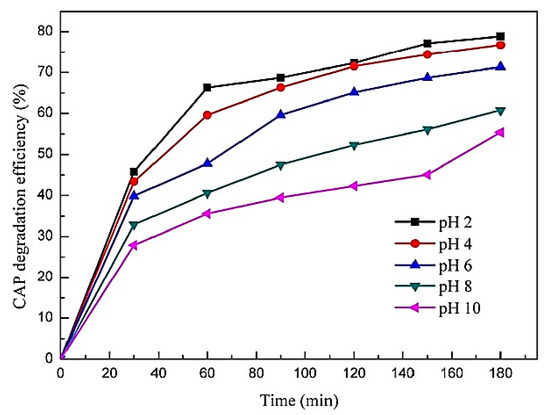 Effect of initial pH of wastewater on the chloramphenicol degradation efficiency of particle electrodes. Reprinted from Sun et al. [107], copyright © (2017) with permission from Elsevier.