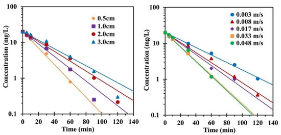 The changes in the spacing of the electrodes would affect not only the mass transfer limitations but also the electron transport and electric resistance [108]. The effect of electrode spacing, however, depends on the direct or indirect oxidation. In the latter case, the electrode spacing should be matched with the diffusion length of *OH species. Duan, et al. [76] found that the oxidation of ceftazidime decreased as the spacing of the Ti/SnO2-Cu electrode changed at 1, 2, and 3 cm under the current of 20 mA. As the spacing increased, the electrochemical resistance also increased while the charge in the electrolyte decreased. Xie et al. [65] (Figure 8) tested ofloxacin removal with the changes in electrode spacing. The reaction rate increased with the first-order pseudo constant changed as the distance decreased from 3 cm to 0.5 cm and the mass transfer coefficient increased.
