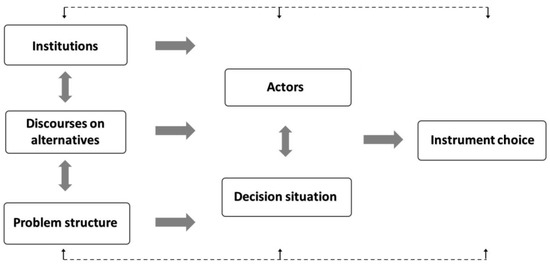 - Finally, the selection of a policy instrument is dependent on the specific decision situation [15]. Relevant instances include what the advocacy coalition framework spells out as “external (system) events” (including changes in socioeconomic conditions or public opinion) and policy decisions and impacts from other policy subsystems (cf. [26,27]), or what the multiple streams framework conceptualizes as “policy windows” [28]. The decision situation can be further understood as the culmination of the “process of social accommodation” among the interests of science and policy [23,24]. In this dimension the contending claims brought in by different or new actors find their way (or not) into policy change or new policy instruments [23,24].