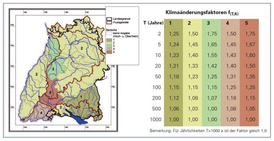 Climate Change Factors table for Baden-Württemberg, indicating catchments (in the columns numbered 1–5) and annuality (in the rows indicating probability of recurrence in years), (KLIWA 2004).