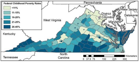 As for social vulnerabilities, 6% of Virginians are under age five and >10% of the population lives below the federal poverty line [,]. Figure 1 shows childhood poverty rates, with many counties above 20% []. Additionally, nearly 19% of Virginians live in food deserts (areas with limited access to nutritious food), which exceeds the national rate by more than 7% []. This coupling of poverty and food deserts means that many children in Virginia live below the poverty line and/or may lack access to diets high in calcium and protein that mitigate strontium damage to bones [,,,,]. Another compounding social vulnerability is that 1.7 million Virginians (22% of the population) rely on PDW, which are unmonitored and unregulated for strontium, among other contaminants, by the federal and state governments [,].
