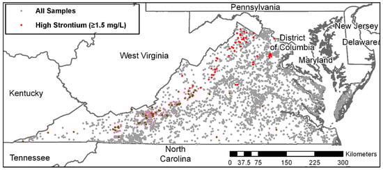 Clean drinking water is essential for a healthy life. The United Nations estimates that 502,000 people die from diarrhea due to contaminated drinking water every year []. In the United States, the Environmental Protection Agency (EPA) enforces the Safe Drinking Water Act (SDWA) to regulate water quality and promote public health []. As knowledge of contaminants increases and treatment techniques improve, the EPA adds new contaminants to the SDWA []. Contaminants are added to the SDWA if they are detrimental to human health, found in waters throughout the United States, and their removal or reduction poses a meaningful opportunity to improve public health []. The third round of new contaminant candidates included strontium due to its detrimental effects on bone growth [,]. However, strontium is still not regulated and, more important to this study, the SDWA only applies to public drinking water systems (e.g., municipal, regulated systems). Thus, a significant gap exists for the 1.7 million Virginia residents (22% of the population) and 15 million people nationally who source drinking water from private drinking water (PDW) systems such as wells, springs, and cisterns []. Characterizing PDW quality has the potential to benefit the health of populations reliant on these systems, especially in Virginia, where 80% of PDWs have never been tested or have been tested only once []. To address these issues, this study examines PDW quality across the state of Virginia with a focus on strontium, which is relatively understudied, and on the candidate list to be added to the SDWA as a regulated contaminant.