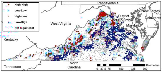Locations of the 122 first draw samples with high strontium concentrations (≥1.5 mg/L) were plotted (Figure 2). Seventy percent of high concentrations were found in the Ridge and Valley province that parallels Virginia’s western/northwestern border (Figure 2). A Global Moran’s I test for clustering produced a p-value of <0.001 and z-score of 24.574, indicating a <1% chance that spatial distributions (i.e., clusters) are a result of randomness. A Local Moran’s I test mapped the clusters (Figure 3), demonstrating that geographic locations with high concentrations of strontium are near other high concentration samples; the pattern of high-high and high-low clusters mirrors the southwest–northwest trend of high strontium displayed in Figure 2.
