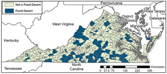 - Virginia Tech; Virginia State University. Food Deserts in Virginia: Recommendations from the Food Desert Task Force; Virginia Tech: Blacksburg, VA, USA, 2014. [Google Scholar]