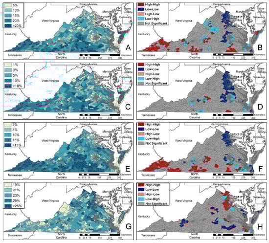 Percent of population <19, percent in poverty, percent of HUNV, percent living in a food desert, and percent receiving SNAP benefits were displayed in ArcMap using five color categories with approximately the same number of counties in each color bracket while still maintaining whole numbers as percentage breaks. The Anselin Local Moran’s I tool was run on all five categories to identify statistically significant geographic distributions of “hotspots” (high-high clusters), “cold spots” (low-low clusters), and outliers (high-low, low-high, and high values surrounded by low values and vice versa). The select-by-attribute tool was used in ArcMap to select high-high clusters and high-low outliers for each of the categories for the state of Virginia. The total number of census tracts and number of selected census tracts for each category were input to Excel. The select-by-location tool was then used to categorize census tracts based on location in the Ridge and Valley province, participation in VAHWQP, and presence of high strontium values. For each of these three selections, the select-by-attribute tool was used to determine the number of high-low outliers and high-high clusters for each subset of census tracts. Finally, the total number of census tracts and number of selected tracts for each category, and each subset of tracts were input to Excel where percentages of census tracts were calculated.