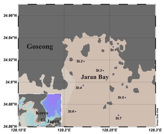 The study site was located in Jaran Bay on the southern coast of Korea, which borders the South Sea (Figure 1). Water samples were obtained at seven different stations in Jaran Bay monthly from April 2016 to March 2017 (Figure 1). The study area has a shallow area within 20 m depth. Using a 5 L Niskin water sampler (General Oceanics Inc., Miami, FL, USA), water samples were collected from two in-situ different light depths (100 and 1%) to include the depth range of the euphotic zone. The light depths were calculated by a Secchi disk using a vertical attenuation coefficient (Kd = 1.7/Secchi depth) from Poole and Atkins []. The water temperature and salinity were measured with a YSI-30 (YSI Incorporated, Yellow Spring, OH, USA). The large zooplankton were removed by 333 μm mesh when the water samples were collected.
