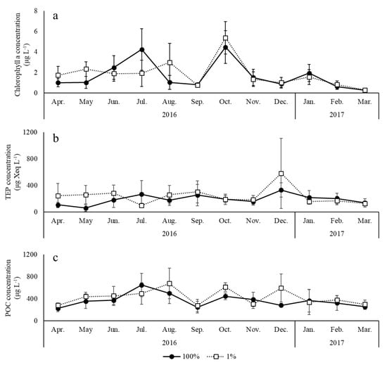 Monthly variations in the (a) transparent exopolymer particles (TEP) (μg Xeq L−1), (b) chlorophyll a (μg L−1) and (c) particulate organic carbon (POC) (μg L−1) concentrations at the 100% and 1% light depths averaged from 7 different stations in Jaran Bay.