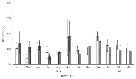 The average TEP-C contributions to POC were 21.4% ± 11.7% at the 100% light depth and 22.0% ± 11.2% at the 1% light depth (Figure 3). The TEP-C contributions to POC were not constant throughout the different months in this study (one-way ANOVA test, p < 0.05). The monthly average contribution of TEP-C to POC was relatively high in September (100% light depth: 35.3 ± 23.8%; 1% light depth: 36.2% ± 19.9%). In contrast, relatively lower TEP-C contributions to POC were found in May (12.8% ± 6.7%; 100% light depth) and July (10.1% ± 3.9%; 1% light depth) (Figure 3).