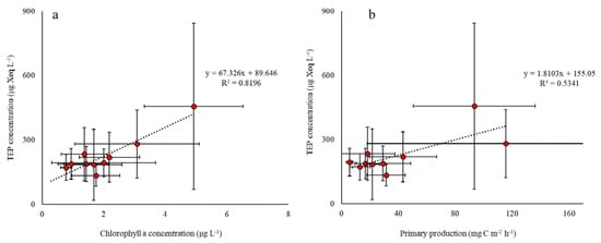 In this study, monthly TEP and chlorophyll a concentrations were not significantly coupled (Figure 2a,b). Previous studies reported strong interrelationships between TEP and chlorophyll a concentrations for some time series [,,,]. In contrast, no strong relationships were found [,], or some correlations were observed for certain periods of the year [,]. Ortega-Retuerta et al. [] observed a 4-month lag phase between chlorophyll a and TEP concentration peaks in the coastal NW Mediterranean Sea (r = 0.48, p < 0.04). In the present study, the cross-correlation analysis indicated a lag-time of two months between chlorophyll a and TEP concentration peaks to a significant degree (r = 0.86, p < 0.01; Pearson’s correlation coefficient) (Figure 4a). Moreover, we observed a two-month lag-phased correlation between TEP concentrations and primary production (r = 0.73, p < 0.05; Pearson’s correlation coefficient) (Figure 4b). Previous studies reported that the lag-phase between chlorophyll a and TEP concentration peaks could be caused by an enhancement in the TEP production rate under nutrient-limiting conditions of phytoplankton after phytoplankton blooms []. Based on the concentrations and molar ratios of nutrients [,,]; no major nutrient limiting conditions were found in this study area except in May 2016 []. In coastal areas, TEP production and removal/consumption processes are influenced by various biotic factors (e.g., phytoplankton biomass and community structure, growth, grazing, and heterotrophy) and abiotic (e.g., stratification, current, tidal, land run-off, and sorption to sediments) processes [,]. In addition, nutrient limitations to phytoplankton growth enhance TEP production rates [,]. Therefore, the lag-phase patterns between chlorophyll a and TEP concentration and primary production and TEP concentration could not be controlled by any single factor.