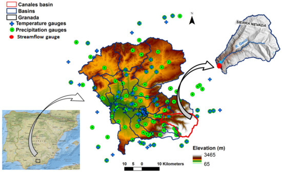 The Canales basin, located in the Alto Genil basin area in South Spain within the Guadalquivir River basin, was used as the case study (see Figure 1). It is an alpine basin in the massif of Sierra Nevada. The Sierra Nevada runs parallel to the Mediterranean coastline, is situated at a latitude of approximately 37° north (N), and comprises more than 20 aligned peaks over 3000 m above sea level (a.s.l.) dividing the area into two climatic zones: a continental one on the northern side and a Mediterranean one on the southern side. The Canales basin covers a surface area of 176.3 km2 in the headwaters of the Genil River, located on the northern flank of the Sierra Nevada. The water resources that circulate through its main course (the Genil River) are regulated by the Canales Reservoir, where the flow is continuously measured [31].
