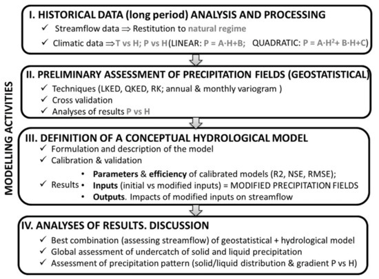 - Although the model performance of the optimal combination of a hydrological model and geostatistical approach is satisfactory (in accordance with Moriasi et al. (2007) [69] criteria), there are some differences in the approximation of the runoff peaks. The proposed future works might improve in considering non-invariant value of the undercatch.