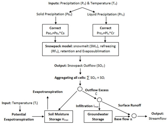 Hence, the inputs of the model are precipitation and temperature. The first step of the model, related to snow, operates in a distributed way (cell by cell), and the second step, related to runoff, operates in a lumped way (adding the results of all cells for each time i). To summarize, Figure 3 shows a schematic representation of the STM.