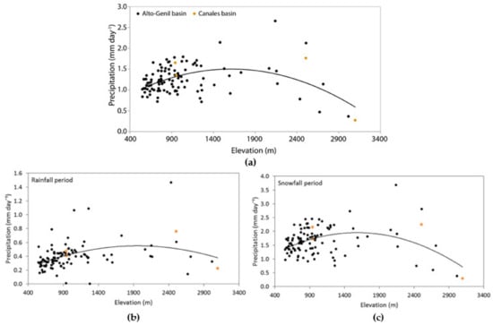 (a) Mean daily precipitation data depending on elevation in the Alto Genil basin, where the Canales basin is located. Trend of precipitation with elevation for (b) the snowfall and (c) rainfall period. Orange dots represent gauges included in the Canales basin.
