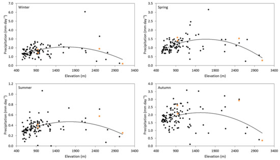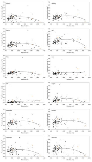The original precipitation data show an inversion of gradient above a threshold of 1600 m. a.s.l. This could be due to a real precipitation pattern or a systematic error in measurement due to undercatch of precipitation. However, temperature has a clear linear relationship with elevation, being lower at higher elevations (see Supplementary Materials, Figure S1). Figure 5 and Figure 6 show the precipitation trend with elevation at a seasonal and monthly scale, respectively.
