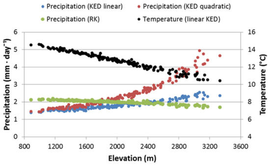 Precipitation fields were estimated by applying three techniques (linear KED, quadratic KED, and RK) to the Alto Genil basin. Daily climatic fields in the period 1980–2014 were estimated with a spatial resolution of 1 × 1 km by applying geostatistical techniques to the available data from the 119 precipitation and 72 temperature gauges positioned in the area (see Figure 1). Elevation was considered as a secondary variable for the estimation. The analysis of experimental data shows a linear relationship between mean temperature and elevation (see Supplementary Materials, Figure S1). Therefore, in order to estimate the temperature fields, KED was applied. The mean daily precipitation data show a quadratic relationship with elevation (see Figure 4). Different hypotheses were considered to approach these precipitation fields by applying kriging with linear drift, with quadratic drift, and regression kriging. Two model options were considered (namely, monthly and yearly variogram analysis) to characterize the spatial data correlation. The performance of these techniques was evaluated through a cross-validation experiment, obtaining satisfactory results for linear KED and RK (see Table 3).