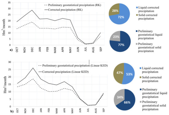 The estimated mean monthly precipitation and its annual distribution between the solid and liquid phases are shown in Figure 8. On the left of Figure 8, the time distributions of the preliminary geostatistical fields are compared with the corrected fields. On the right of Figure 8, the pie charts show the proportions of solid and liquid precipitation.
