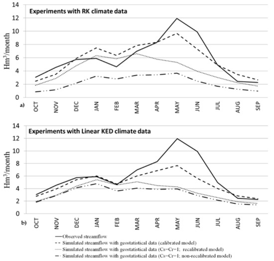 The best results provided by the STM model using the RK approach can also observed graphically in Figure 9a and Figure 10a. The estimated monthly mean streamflow (mean year) indicates that RK is a better approach in terms of both mean water balance and temporal distribution (Figure 9). If we do not correct the precipitation fields, we cannot approach the maximum mean streamflows that occur during the late spring in the snowmelt season. Nevertheless, while the models with the corrected fields obtained for both geostatistical approaches (RK and linear KED data) underestimate the peak of the hydrographs (Figure 9), they are clearly closer than the solutions obtained without correcting the precipitation fields. Figure 9 shows a poor simulation when the precipitation is not corrected, with a large underestimation of streamflow in spring due to less snowfall in winter. Figure 10a shows that the model with RK data reproduced the streamflow fairly well, with the low flows better reproduced than the peak ones. In contrast, Figure 10b shows how the model with linear KED data is poorer with both low and high flows.