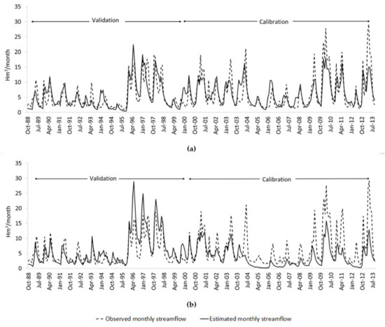 Table 5 summarizes goodness of fit obtained when these three approaches are applied to propagate the climatic fields generated by two different geostatistical models (RK and linear KED). Table 5 shows that the NSE values in the calibrated model (1) (including Cs and Cr) for the RK precipitation field are reasonably good. In the calibration period, the daily and monthly NSE are 0.56 and 0.68 respectively, with R2 being 0.58 and 0.7, and PBIAS being 1.91% and 1.90%. In the validation process, the NSE values obtained are similar at 0.48 and 0.63 respectively, with R2 being 0.52 and 0.67, and PBIAS being −0.35% and −0.36%. Logically, the mode performance is better at the monthly scale, although it works reasonably well at the daily scale. From the standpoint of water resources planning and management, the higher agreement obtained in the monthly streamflow assessment with the proposed preliminary undercatch correction is important in defining the regular operation of the resources at basin scale. This is due to monthly steps usually being employed in analyses of water resources operation at the basin scale [73,74]. At the monthly scale, the model is classified as “good” in the calibration phase and “satisfactory” in the validation process based on NSE and following the widely used [61] criteria published by Moriasi et al. (2007) [69] (see Table 1). Although the performance at the daily scale is lower, the model is classified as “good” in the calibration phase and “satisfactory” in the validation period, and its rating is very close to the good one. The PBIAS values are lower than 10%; thus, they are classified as “very good” in all cases of the calibrated model (1) for the RK precipitation field (see Table 1).