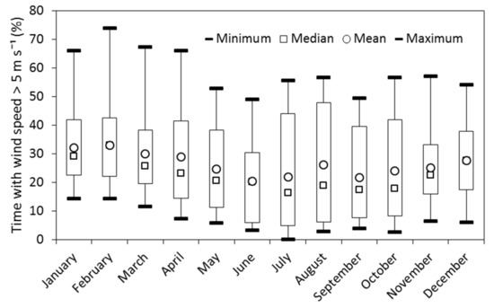 Percentage of time with wind speed above 5 m∙s–1 in the Sierra Nevada mountain range.