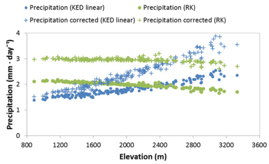 The corrected values of precipitation allow us to assess the corrected precipitation patterns with altitude (gradient with altitude) in this alpine basin (Figure 12). As mentioned above, linear KED shows better results in the cross-validation experiment but RK provides a better approximation of the evolution of precipitation with altitude, observed in the experimental data (see Figure 4). With respect to the corrected precipitation, linear KED gives an increase in precipitation, especially at higher elevations, because the snowfall correction coefficient is higher than the rainfall correction coefficient (1.80 vs. 1.07). Nevertheless, the approximation obtained for streamflow using the linear KED values as inputs to the STM model is significantly worse than that obtained using RK values. For the RK approach, the difference between these coefficients is less significant: 1.78 for snowfall and 1.40 for rainfall. The RK approach reduces the negative gradient of precipitation initially predicted by the RK for altitudes above 1000 meters, due to the phenomenon of gradient inversion (decrement of precipitation with altitude above a specific elevation threshold, described in Reference [30]). That research made a preliminary correction of the experimental data in the Alto Genil basin by applying experimental correction functions proposed by Buisan et al. (2017) [14] for certain Spanish mountain ranges. The correction function was applied to the experimental data above an elevation threshold, which was estimated as the median (50th percentile) of the snowline elevation for each month of the snow season (approximately 2000 meters). However, the estimates below this threshold were modified due to the spatial correlations of the estimates. For the Canales basin, these authors obtained mean correction coefficients of 1.17 and 1.09 for linear KED and RK, at elevations below 2000 meters and coefficients of 1.29 and 1.28 for elevations above 2000 meters. These values are lower than those obtained in the present study; however, the correction functions were obtained for other mountain ranges, and there are no specific data available for our case study. Table 6 shows the mean daily precipitation in the stations located in the case study (marked in orange in Figure 4) obtained from both the measurements alone and the precipitation series derived using different geostatistical techniques.
