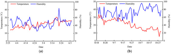 Daily average temperature and humidity in the spring trial (a); daily average temperature and humidity in the autumn trial (b).