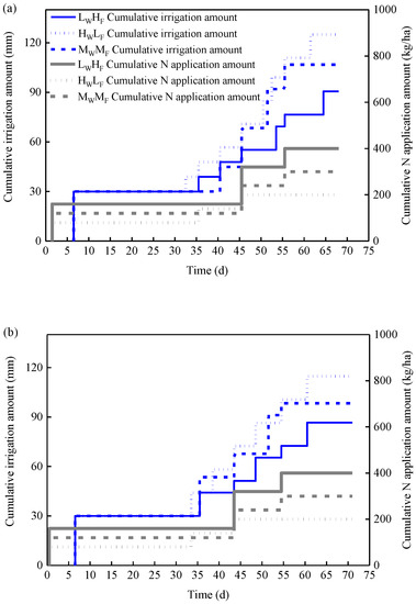 Water and N applied in the spring cabbage growth period, with March 23 as the first day (a); water and N applied in the autumn cabbage growth period, with August 18 as the first day (b).