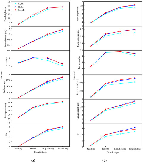 Comparison of plant height, stem diameter, leaf number, leaf area, leaf spread and LAI increments of spring cabbage in different stages in response to various treatments (a); comparison of plant height, stem diameter, leaf number, leaf area, leaf spread and LAI increments of autumn cabbage in different stages in response to various treatments (b).