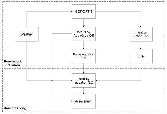 Our proposed methodology aims to include the AquaCrop-OS model into the multiplicative approach of Doorenbos and Kassam [20], with the objective of determining under local conditions (i.e., for a given crop, soil, weather, sowing date, and management) at each growth stage.