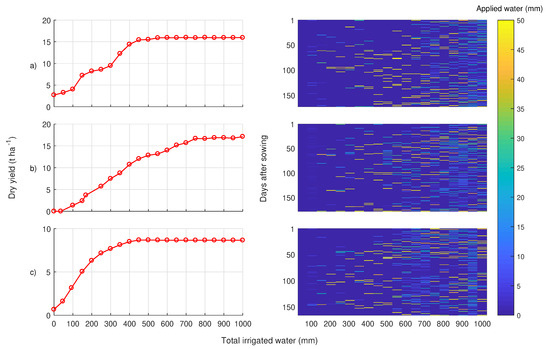 Water-yield functions (left side) and optimal irrigation schedules (right side) for maize (a), sugar beet (b), and wheat (c) under clay loam soil conditions.