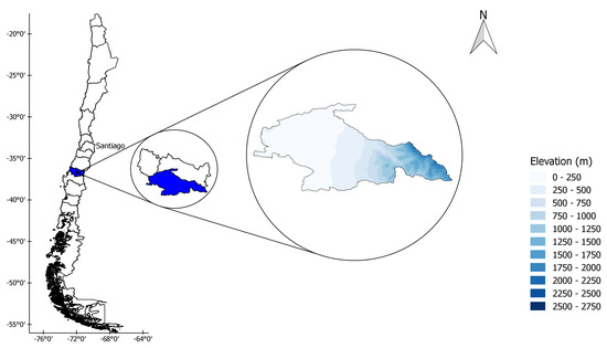 - DGA. Diagnóstico y Clasificación de los Cursos y Cuerpos de Agua Según Objetivo y Calidad; Cuenca del río Itata: Santiago, Chile, 2004. [Google Scholar]