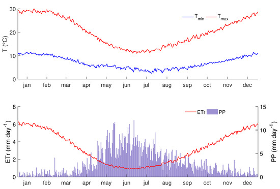 Sowing dates for maize, wheat, and sugar beet for each year correspond to the first day of November, September, and August, respectively [47]. A weather database from 1970 to 2014 (Figure 4) was extracted from the Explorador Climático website (http://explorador.cr2.cl/). Reference evapotranspiration was estimated according to Allen et al. [48]. Crop parameters from the AquaCrop-OS [37] database were considered (see Table 1). On the other hand, soil hydraulic parameters (Table 2) were extracted from Granda et al. [45] and saturated hydraulic conductivity (Ks) was estimated using the RETC model [49]. Soils in the area of study are mainly derived from volcanic ashes, with strong vertical and horizontal variability. The data in Table 2 are based on field studies (see Granda et al. [45] and Kuschel-Otárola [50]), such that the Ks values lie in the range of variation and provide realistic values for representative soils. However, we draw attention to the fact that andesitic soils are less-studied soils and show high variability in hydraulic parameters, despite having similar texture. Moreover, agricultural operations have effects on changes in bulk density which are not always accounted by pedotransfer functions. For soils, the numbers 1, 2, and 3 correspond to low, medium, and high bulk density, respectively. Each growing season started with 50% of the total available water. Regarding fertilisation, there was no differentiated management to not alter the water management conditions.