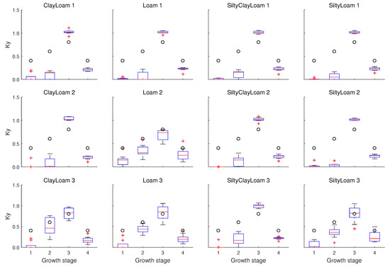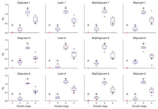 Figure 6 shows the values for sugar beet at each growth stage and for each soil type. Similarly to the results obtained for maize (Figure 5), the value in the first growth stage was close to zero for all soil types, indicating that yield is not affected when there is enough water in the soil profile. It reached its maximum value in the third growth stage for most soil types; except for clay loam soil with high bulk density, where this value was the lowest (compared with the other soil types). Furthermore, this soil type presented the highest values for the second and fourth growth stage. The obtained values were lower than those proposed by the FAO [51], for each growth stage.