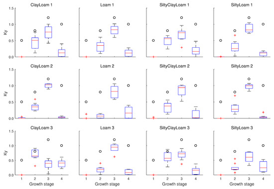 Figure 7 shows the values for wheat for each growth stage and for each soil type. Similarly to the results obtained for maize (Figure 5) and sugar beet (Figure 6), the value in the first growth stage was close to zero, except for loam soil with medium bulk density ( = 0.15). Regarding the value for the third growth stage, this value was relatively low when compared to maize and sugar beet. The lowest value for the third growth stage was presented in loam soil with medium bulk density ( = 0.73); this soil type also presented a value over the percentile for the second growth stage ( = 0.30). With the exception of the third growth stage, the obtained values were lower than those proposed by the FAO [51]. Soils with high bulk density (index number 3) showed lower differences, with respect to the values proposed in the literature.