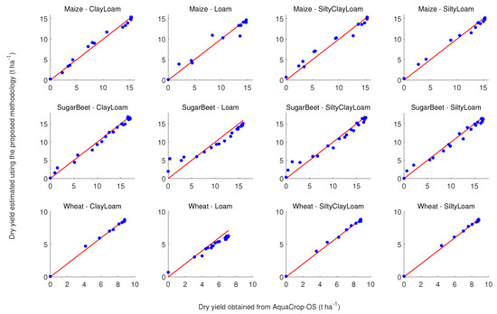Figure 8 shows the comparison between the dry yield obtained by AquaCrop-OS (red line 1:1) and the estimates obtained by the proposed methodology (blue dots). There was generally a good agreement between the results obtained by AquaCrop-OS and the proposed methodology, with NRMSE values ranging from 1.62% (wheat in a silty loam soil) to 15.80% (sugar beet in a loam soil). The values used in this case were extracted from the benchmark between 2010–2014 (see Table 3). According to Steduto et al. [28], sugar beet (Beta vulgaris) is a biennial plant which produces a large storage root as a part of its tap root, containing 14–20% sucrose on a fresh mass basis; thus, the crop yield values of sugar beet can reach 80–120 t ha−1.