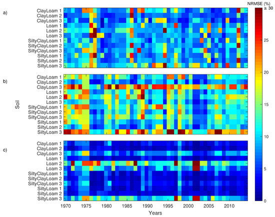 The benchmarking for all years was carried out by determining the Normalised Root Mean Square Error (NRMSE) for every year. Figure 9 shows the NRMSE values for each year for maize (a), sugar beet (b), and wheat (c), for all soil types, where the lowest and highest values are presented in blue and red, respectively. According to the classification suggested by Jamieson et al. [41], the values are ranged from 0% to ≥ 30%. It can be seen that wheat presented the best performance.