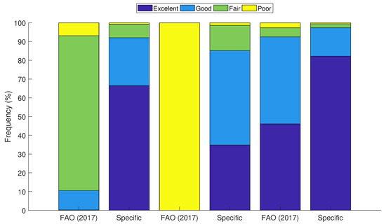 Comparison of the frequency of NRMSE values obtained by the proposed methodology and recommended by CROPWAT database [51].