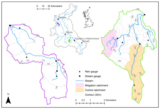This case study used data collected from two instrumented sub-catchments investigated by the EdenDTC (Demonstration Test Catchments) project; these are located in the River Eden catchment in Northwest England [6,20,25,26], see Figure 2 below.