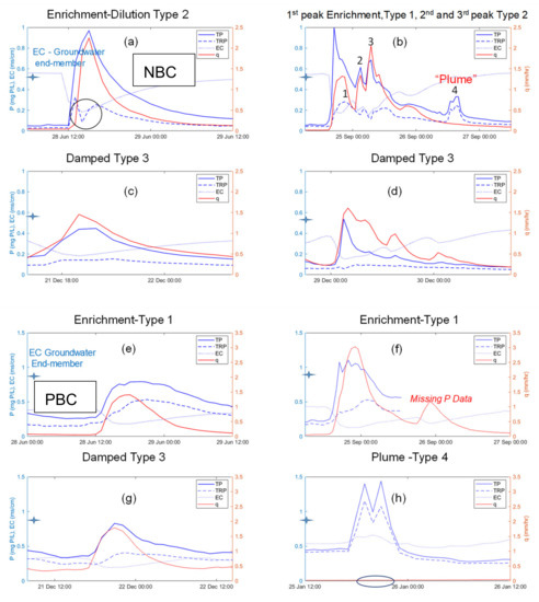 - A “plume” event in the PBC was observed (Figure 3: pane (h)). Here, the nutrient plume occurred at very low rainfall and there was no detectable increase in flow. Thus, the forensic analysis and any model would struggle to simulate this event. The EC signal was most important here, it was the only occurrence found of EC rising during the event, i.e., no dilution. Clearly, the TP signal was dominated by this small but significant nutrient release that could have a high impact on eutrophication risk and ecology. This scenario is equivalent to the “type 3” event of Haygarth et al. [28]. These events seem to be rare especially in the NBC. Part 4 of the NP6 event in the NBC (Figure 3: pane (b)) could also be labelled as a plume event as flow was decreasing during the falling limb of the hydrograph when a “spike” of TRP was detected, but this was unusual.