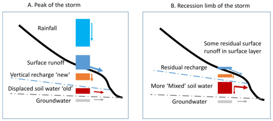 In Figure 4, we see the flow pathways, firstly during the peak of an event (part A) and secondly during the recession (part B), these transport P during the runoff events discussed above. We can assume that only groundwater and a small amount of the soil water drains to the outlet in the inter-event periods. Here, we suggest that the enrichment in TP is driven primarily by the surface water flow pathway in all event types (except for “Plume” events). Figure 4 also shows the pivotal role the vertical recharge plays in controlling TRP concentration. The TRP flux pattern is caused by dynamic mixing of the old and new water during differing parts of the events. The observed data shows initially some displacement of “old” water (”E” and “ED” Types) but in the ”D-Type” events the temporary influx of new water dominates the signal whilst it is still raining producing a damping effect. After the rainfall stops, the mixed “old” and “new” water now dominates. Any dilution in the EC signal is lost and EC then rises as the older water starts to dominate again as the recharge ends. This means that the “D-Type” signal pattern is only an artefact of the mixing ratio as seen in the ”E” and “ED” Type events. All event types should have much higher peak TRP concentrations (as in the ”E” Type examples) but for this dilution factor. This might also suggest that the “Plume” Type event on 25th January 2013 in the PBC (labelled “Plume” on Figure 3: pane (h)) fitted an example where surface runoff did not increase and no dilution occurred, but there was either enough recharge to displace the old P-rich source or a source of P related to land use practices (e.g., a leaking slurry tank). Thus, the dominance of the surface runoff pathway is clear, and more so in the NBC than the PBC. The damped and dilution signals are, in fact, the same process varying over time and controlled by either the greater soil depths in PBC or by the rainfall intensity–duration patterns. The tail end of the recession still includes the higher TRP concentrations, but there may be a small residual flow component coming from the faster surface pathway with some flow through the upper soil layers.