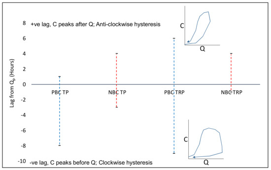 Plot showing the range of lag times for TP and TRP in NBC and PBC for all events. The lag times were calculated from the observed data from when the peak concentration (of TP and TRP) occurred relative to the time when Qp occurred. Sketches of Q-C relationships during hysteresis loops are also shown for clockwise and anti-clockwise hysteresis.