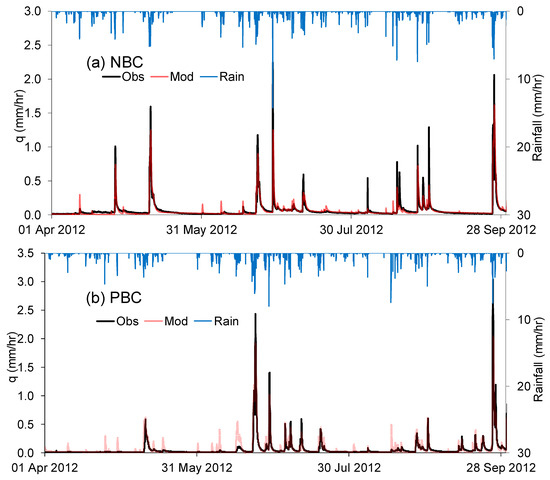 Time series plots of observed and modelled runoff and rainfall for the periods April 1st–September 30th 2012, and 1st December 2013–31st January 2014, from the NBC and PBC are shown in Figure 6. The first time period was part of the model calibration period for both catchments whilst the second was part of an independent validation period.