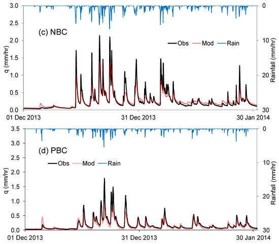 Time series plots of Observed and Modelled specific discharge (q) and rainfall at (a,c) NBC (b,d) PBC outlets: panes (a,b) showing (part of) calibration period (April–September 2012); panes (c,d) showing (part of) validation period (December 2013–January 2014).
