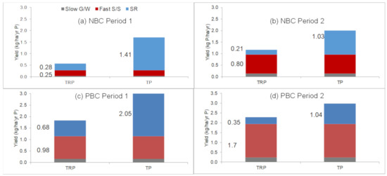 The results clearly indicate the following phenomena. Firstly, the patterns of the modelled P yields are in broad agreement with the observed P yields in that the PBC was predicted to export a higher overall yield of TP than the NBC, which was mainly because the SRP yield was much higher from the fast subsurface store (soil water). These results were achieved by ensuring reasonably tight criteria when modelling in terms of insisting on a mass balance error (observed—modelled yield) of less than ±15% and a positive Nash and Sutcliffe efficiency (NSE) for both TP and TRP concentrations, for the calibration period, and desirable (see Table 3) for the validation period. Secondly, the flow pathways that the model determined differ between catchments, in that the PBC has a dominant fast subsurface (“Fast SS”) pathway (contributing SRP) but the NBC was dominated by the (faster) surface runoff pathway (“SR”) which was mostly contributing PP but also some TRP (e.g., particulate forms of reactive P that are sediment-bound).