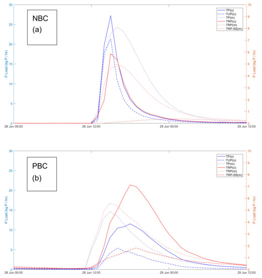 In both the NBC and PBC, the flow pathways that transported TP to the catchment outlets were first thought to be dominated by surface runoff, as evidenced by the high runoff coefficients [26]. However, there were some major differences in the observed load and concentration dynamics in the two catchments (as identified above in Section 3.1 through the event forensics). In terms of the observed differences in P dynamics, the following deductions were made:
